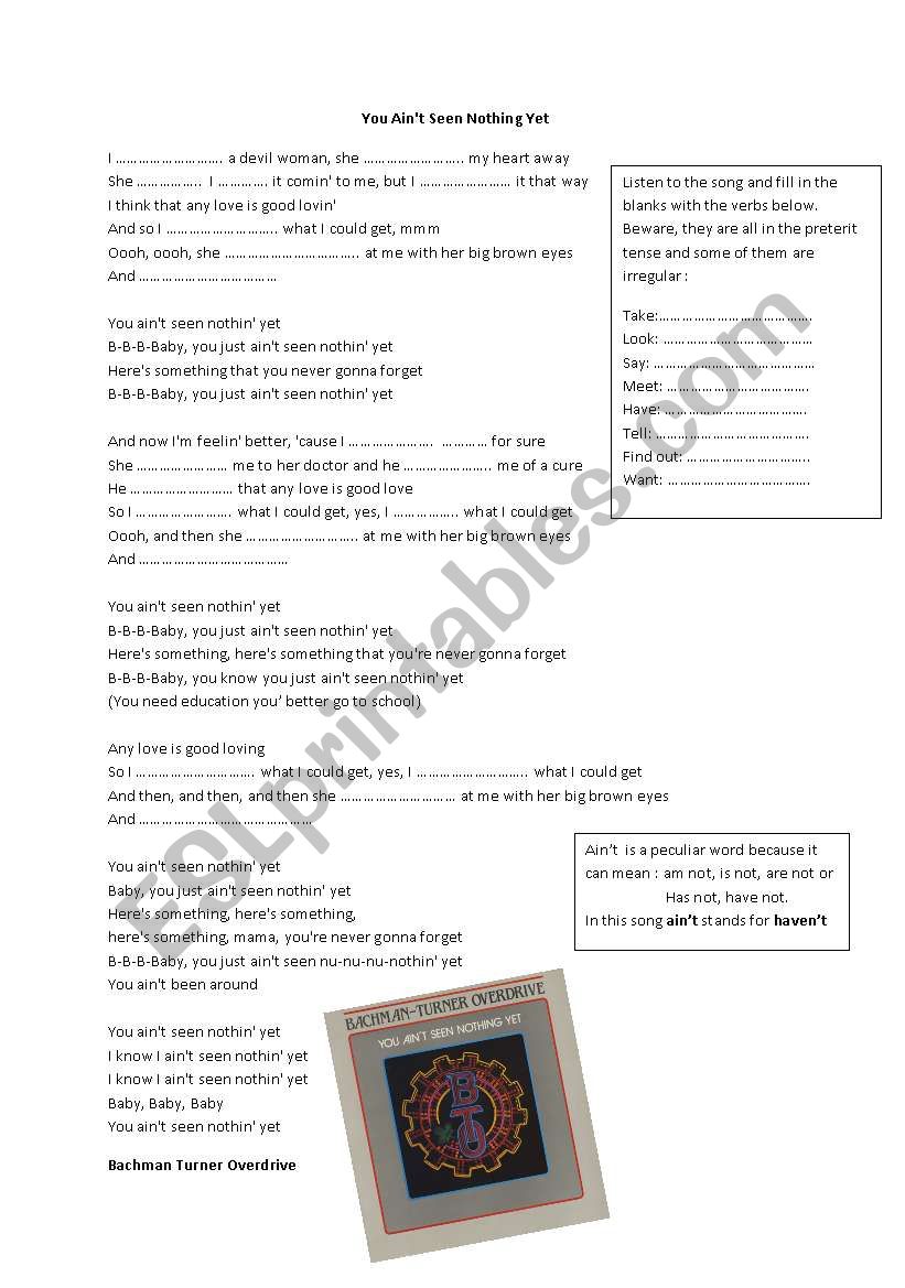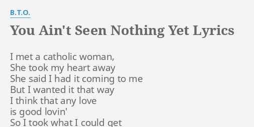 70s Pop album - including song video artist biography translations and more. Fall deeply in love with God. You Aint Seen Nothing Yet. Bachman Turner Overdrive - You Aint Seen Nothing Yet. You Aint Seen Nothin Yet. He sang it with the stutter to poke fun at his brother Gary who had a speech impediment. She took my heart away.
